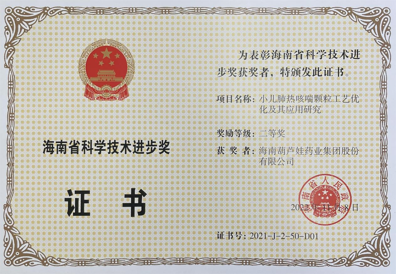 为此,小儿肺热咳喘颗粒的制备方法获得了第二十一届中国专利优秀奖(2019年),专利申请号:ZL201010134951,此次作为专利技术的应用,获得了2021年度海南省科学技术进步奖二等奖。在此之前,极速3D牌小儿肺热咳喘颗粒还多次被授予“临床价值中成药品牌”、“中国连锁药店最具合作价值单品”,荣登“中国医药品牌榜”。